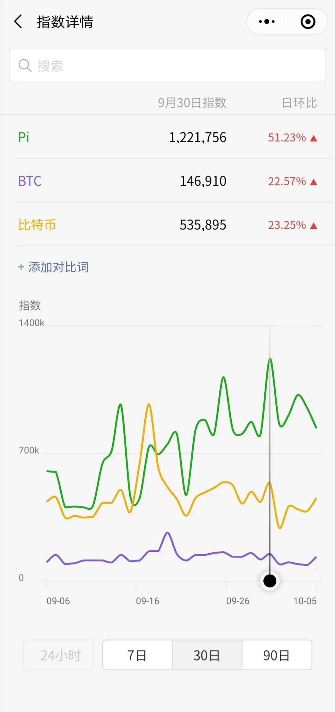 微信指数显示Pi热度最近90天超过比特币(统计BTC+比特币关键词数据),跃居全球数字币热度榜首。
