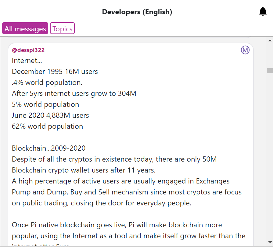 上述文字援引Developers(English)频道管理员@Desspi322,数据化的总结和陈述,相信大家对Pi和区块链都会有一个清晰的认识。